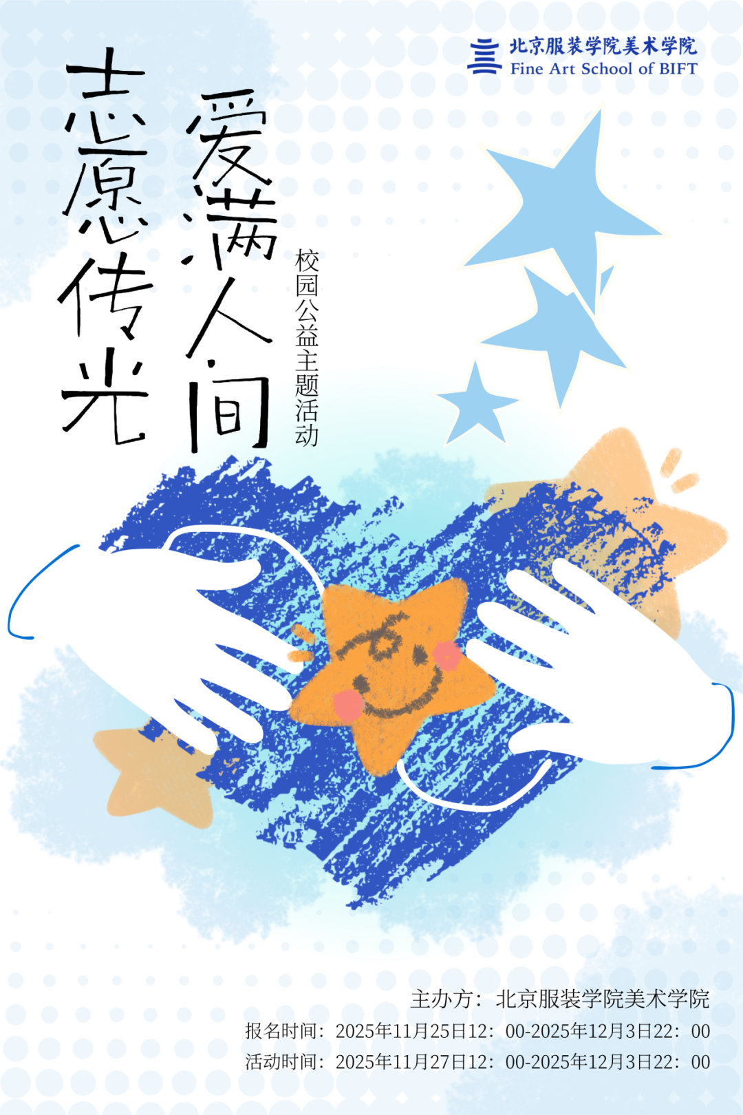 为弘扬“奉献、友爱、互助、进步”的志愿精神,向偏远地区的孩子们传递关怀与温暖,11月27日至28日,由美术学院团总支主办的“志愿传光·爱满人间”校园公益主题活动,在芍药居校区温情开展。活动自启动以来,得到了同学们的广泛关注与热烈响应,大家纷纷执笔抒怀,将心底最真挚的祝福与期盼,化作一缕缕星光,送往远方的孩子身边。